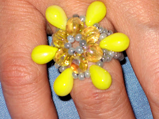 Eseguito artigianalmente con filo di nylon, ha al centro cristalli luminosi color ambra dorato, il contorno è di gocce di vetro color giallo intenso, questo in foto ha misura 19. E' un anello grande e molto solare.