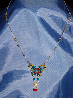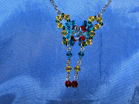 Eseguita artigianalmente, questa farfallina risplende dei colori brillanti degli Swarovski verdi, gialli e rossi. Chiusura a moschettone, parti metalliche nikel free, misura cm 52.